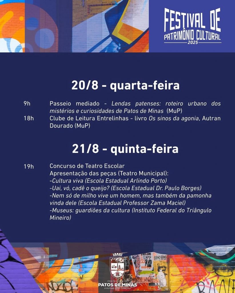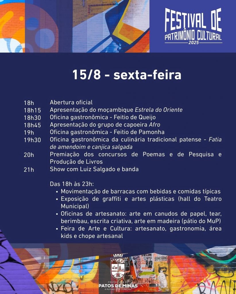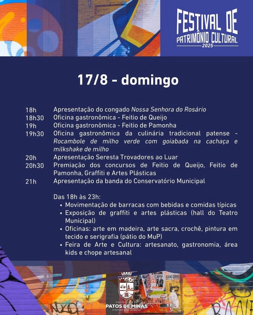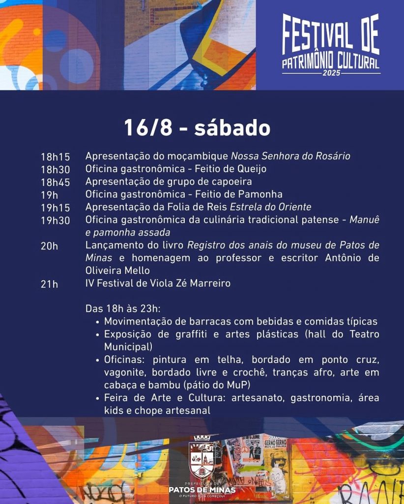 A cultura de Patos de Minas em evidência: essa é a principal proposta do Festival de Patrimônio Cultural, evento que será realizado de 15 a 21 de agosto. A jornada reunirá diferentes formas de manifestação artística para celebrar o que Patos tem de mais valioso: sua gente e suas tradições. Durante sete dias, praças da Avenida Getúlio Vargas, o museu e o Teatro Municipal serão palco de apresentações que trarão cor, som e vibração para a região central da cidade. A programação será diversificada, incluindo, entre outras atrações, oficinas gastronômicas de feitio da pamonha e do queijo, música ao vivo e exposições artísticas. O IV Festival de Viola “Zé Marreiro” e a premiação dos concursos de teatro e poema também estão confirmados para o festival, que contará ainda com movimentação de barracas de bebidas e comidas típicas.
